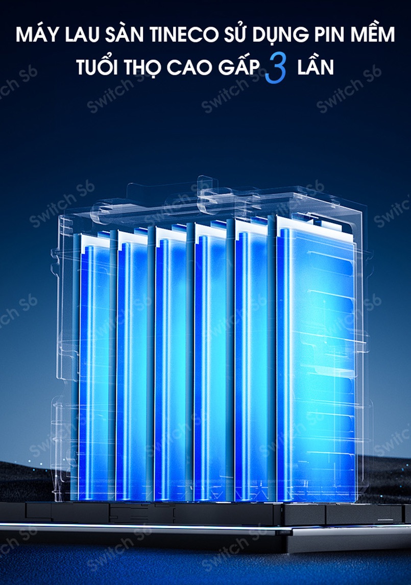 Máy hút bụi lau sàn Tineco Floor One Switch S6 được trang bị loại pin mềm, có tuổi thọ gấp ba lần so với các loại pin truyền thống. Sự cải thiện giúp tuổi thọ pin cao hơn, giảm bớt trọng lượng của máy và gia tăng tính di động. Ngoài ra, quá trình hình thành áp suất và nhiệt độ cao trong quá trình sạc giúp củng cố cấu trúc pin, đảm bảo sự ổn định và hiệu suất cao.