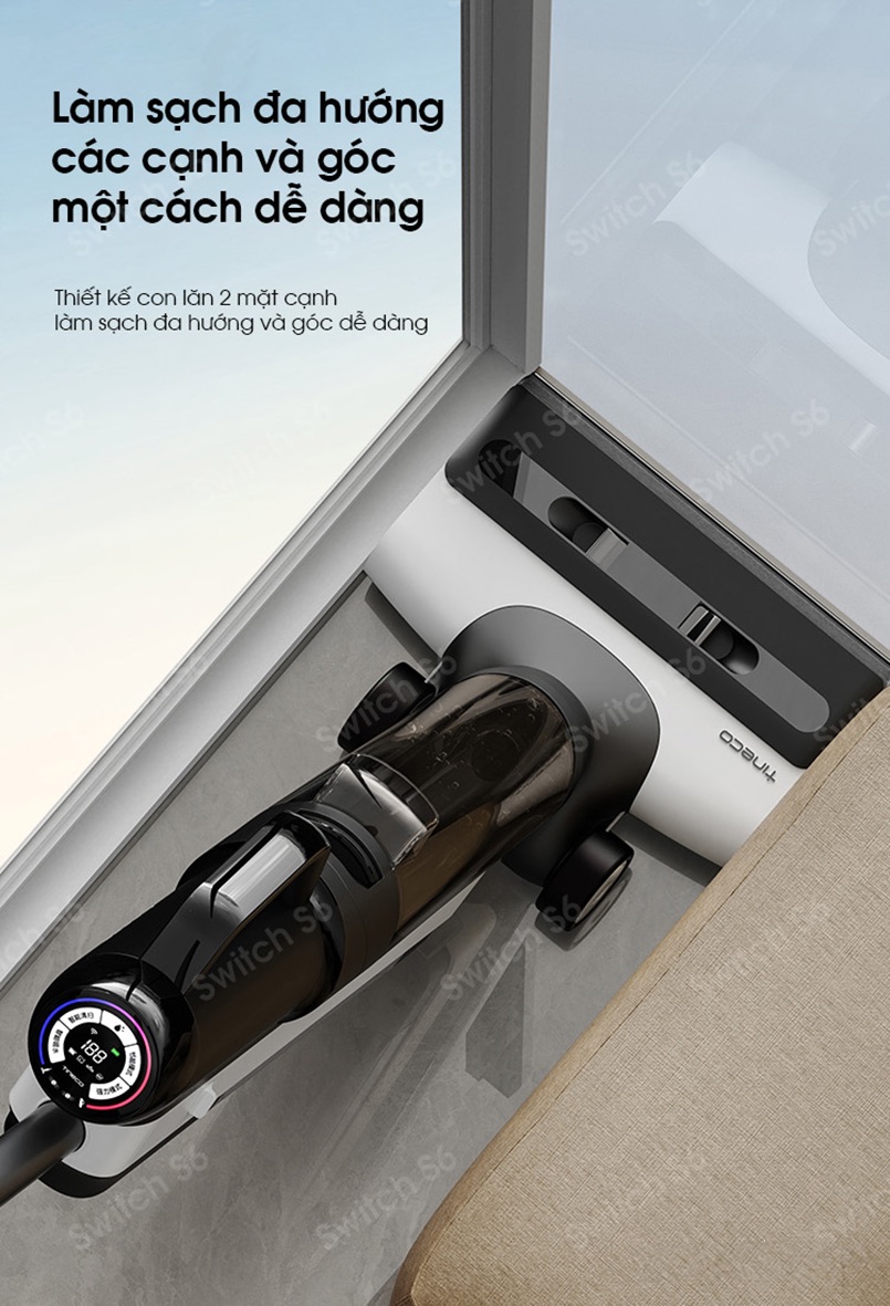 Thiết bị chải con lăn của máy hút bụi có khả năng chải sạch mọi bề mặt, bao gồm cả các góc cạnh phức tạp. Nhờ khả năng chải cả hai chiều, từ trái sang phải và ngược lại, Tineco Floor One Switch S6 có thể dễ dàng xử lý các khu vực góc khuất phức tạp, khó khăn mà những máy hút bụi thông thường không thể đạt được. Điều này đảm bảo rằng không còn bụi bẩn nào bị bỏ sót trên sàn nhà, kể cả những vùng tối tăm hay góc bàn.