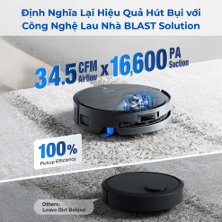 Nhờ có BLAST, Hiệu suất hút bụi của Ecovacs X9 Pro Omni vượt trội, cho phép hệ thống đạt lực hút mạnh mẽ 16.600 Pa, cải thiện đáng kể khả năng làm sạch sâu. Điều này được minh chứng qua tỷ lệ loại bỏ bụi trên thảm của Ecovacs X9 Pro Omni tăng tới 137,6%. Dù ưu tiên luồng khí lớn, hệ thống vẫn duy trì lực hút ổn định và ấn tượng: Ecovacs X9 pro có khả năng thu gom 100% các mảnh vụn lớn như hạt ngũ cốc, đồng thời xử lý hiệu quả cả bụi mịn lẫn các tác vụ vệ sinh phức tạp.