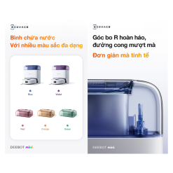 Bên cạnh đó, Ecovacs Deebot Mini không chỉ gây ấn tượng bởi vẻ ngoài mà còn được tích hợp đầy đủ các tính năng làm sạch mạnh mẽ của nhà Ecovacs: sấy khô khăn lau bằng khí nóng, tự động đổ rác và tự động giặt giẻ thông minh. Ecovacs Deebot Mini cùng trạm sạc nhỏ nhất từng được Ecovacs phát triển, giúp thiết bị hòa hợp liền mạch với không gian sống hiện đại, tối giản. Cuối cùng, điểm này khiến các chị em chúng ta phải hào hứng đó chính là trạm sạc nổi bật với tùy chọn bình chứa nước màu sắc rực rỡ, góp phần tạo điểm nhấn thời trang, cá tính cho ngôi nhà.