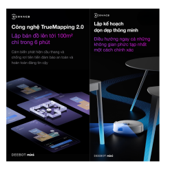 Công nghệ TrueMapping 2.0 của Ecovacs Deebot Mini được đánh giá là “siêu đỉnh”, cho phép thiết bị lập bản đồ không gian rộng đến 100m² chỉ trong 6 phút (dữ liệu được đo lường theo kết quả thử nghiệm tại phòng lab Ecovacs – đây là điều kiện lý tưởng, ít vật cản). Công nghệ này giúp Ecovacs Deebot Mini dễ dàng điều hướng hiệu quả, nhanh chóng và vẫn đảm bảo độ chính xác cao, ngay cả trong những khu vực có bố trí phức tạp nhất.