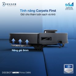 Tính năng Carpets First một tính năng mới hoàn toàn của nhà Ecovacs giúp giữ thảm luôn khô sạch, tránh tình trạng ẩm ướt trong suốt quá trình làm sạch. Nhờ được tích hợp tính năng này, Ecovacs Deebot T30C Prime Omni sẽ ưu tiên xử lý khu vực thảm trước bằng chế độ hút bụi, hạn chế tối đa việc giẻ lau tiếp xúc với bề mặt sợi vải. Khi phát hiện thảm trong lúc di chuyển, hệ thống tự động nâng giẻ lau lên đến 9mm, ngăn nước và bụi bẩn lan sang các khu vực khác.