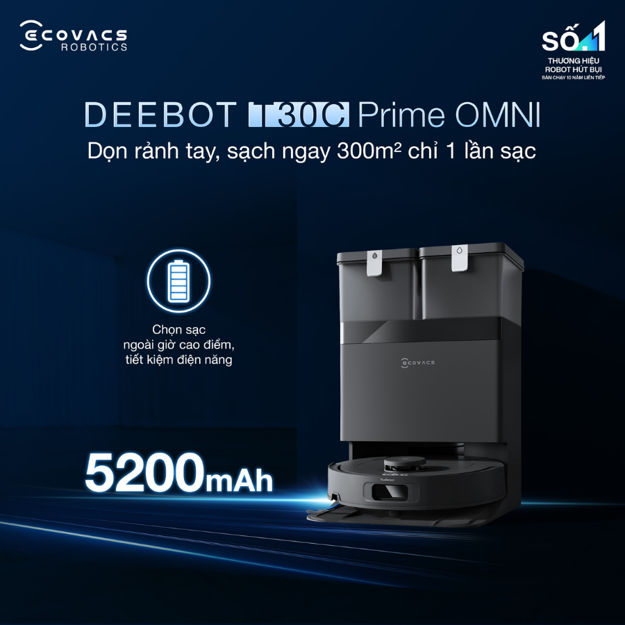 Viên pin dung lượng 5200mAh giúp robot hút bụi lau nhà Ecovacs Deebot T30C Prime Omni duy trì thời gian hoạt động lên tới 220 phút sau mỗi lần sạc. Nhờ khả năng vận hành bền bỉ, thiết bị có thể làm sạch hiệu quả trên diện tích lớn mà không cần dừng giữa chừng. Điều này giúp giảm số lần sạc, đảm bảo quá trình dọn dẹp diễn ra liên tục, phù hợp cho không gian rộng hoặc nhiều phòng.
