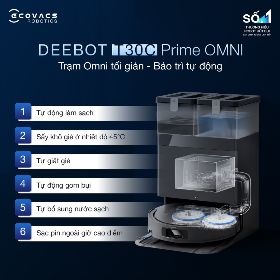 - Trạm OMNI tự động toàn diện, hút rác, giặt và sấy giẻ tiện lợi.