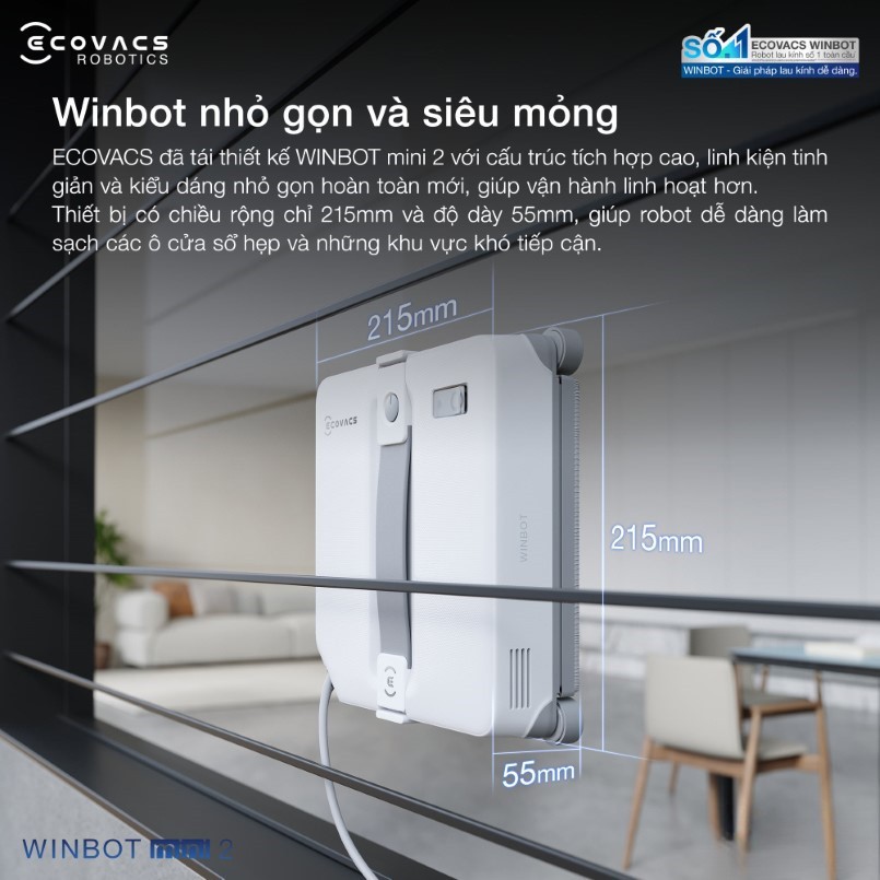 Ecovacs Winbot Mini 2 với thiết kế hoàn toàn mới: nhỏ gọn, tinh giản linh kiện và tối ưu cấu trúc, giúp vận hành linh hoạt hơn bao giờ hết. Với chiều rộng chỉ 215mm và độ mỏng 55mm, robot dễ dàng tiếp cận mọi ô cửa hẹp hay vị trí khó lau.