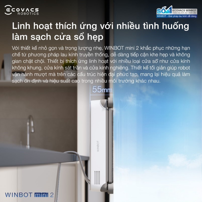 Ecovacs Winbot Mini 2: Nhỏ gọn, linh hoạt, phù hợp cửa sổ nhỏ, diện tích dưới 30m²