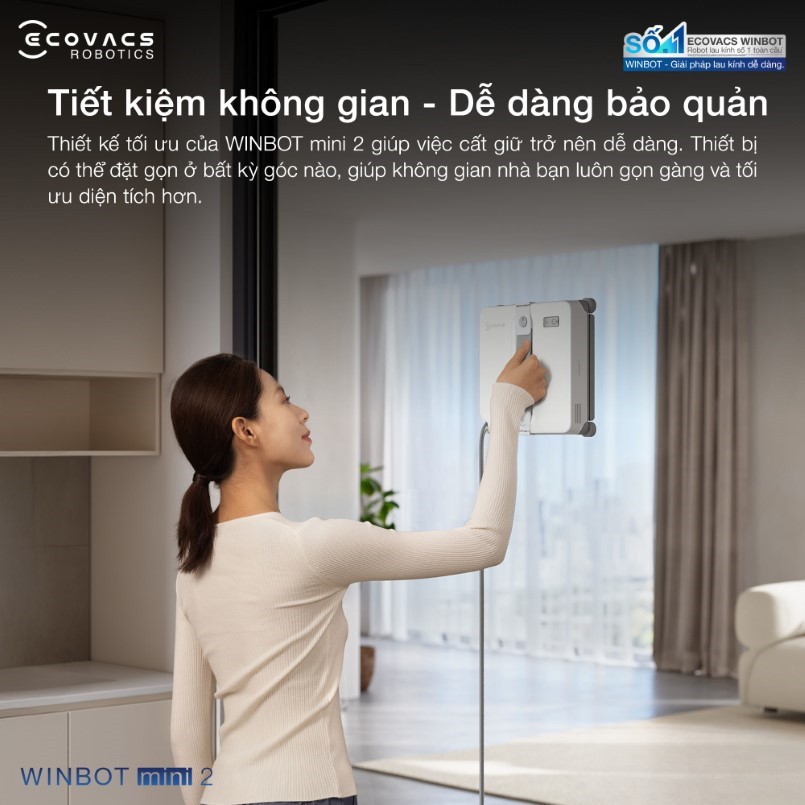 Không chỉ mạnh mẽ khi vận hành, Ecovacs Winbot Mini 2 còn ghi điểm ở tính tiện dụng: dễ dàng cất gọn trong mọi không gian nhỏ. Một giải pháp làm sạch thông minh, gọn gàng – hoàn hảo cho lối sống hiện đại.