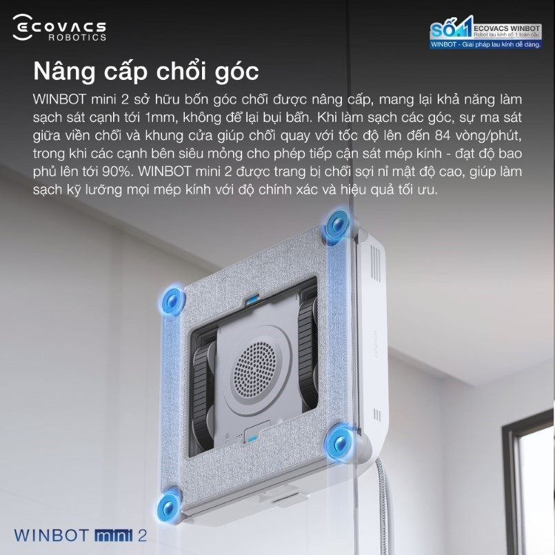 Ngoài ra, cơ chế vận hành thông minh của Ecovacs Winbot Mini 2 cho phép chổi tăng tốc lên đến 84 vòng/phút khi gặp góc cạnh, kết hợp cùng sợi nỉ mật độ cao giúp vừa làm sạch, vừa đánh bóng bề mặt kính hiệu quả. Nhờ vậy, độ bao phủ đạt tới 90%, mang lại kết quả sáng bóng toàn diện cho từng ô cửa – chuẩn sạch sâu trong không gian sống hiện đại.