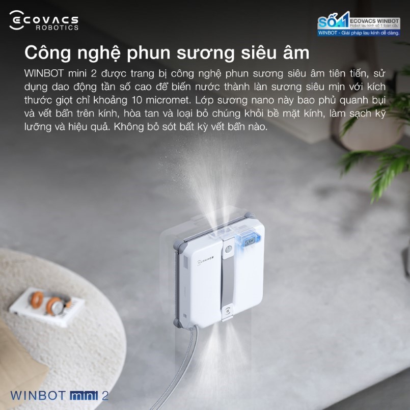 Ecovacs Winbot Mini 2 được trang bị công nghệ phun sương siêu âm hiện đại, biến nước thành các hạt sương Nano siêu mịn chỉ 10 micromet. Nhờ có lớp sương này thẩm thấu nhanh, nên đã giúp Ecovacs Winbot Mini làm mềm và đánh bật bụi bẩn bám dính trên bề mặt kính.
