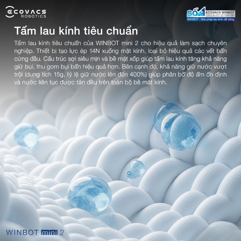 Điểm nổi bật nằm ở khả năng giữ nước ấn tượng: dung tích 15g và tỷ lệ lưu trữ lên đến 400%. Nhờ phân bổ độ ẩm thông minh, khăn của Ecovacs Winbot Mini 2 luôn duy trì độ ẩm ổn định và trải đều trên bề mặt kính, giúp làm sạch liên tục, không để lại vệt nước hay cảm giác khô nhám.