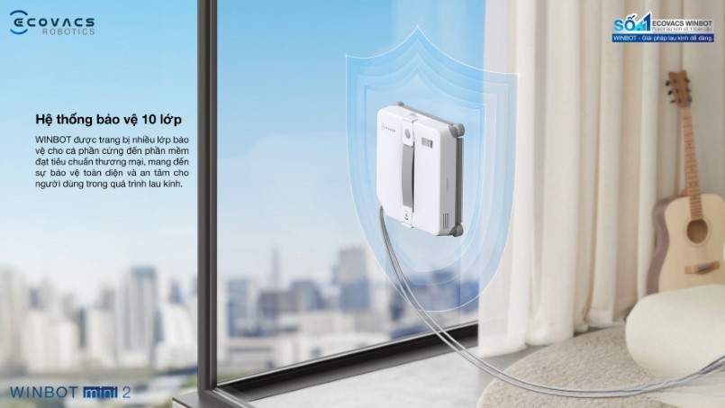 Ecovacs Winbot Mini 2 được trang bị hệ thống bảo vệ toàn diện 9 lớp, kết hợp chặt chẽ giữa phần cứng và phần mềm. Nhờ đó, thiết bị vận hành ổn định và an toàn ngay cả ở những vị trí cao hay bề mặt kính lớn. Đây được đánh giá là giải pháp làm sạch không chỉ thông minh mà còn mang lại sự an tâm tuyệt đối cho mọi gia đình hiện đại.