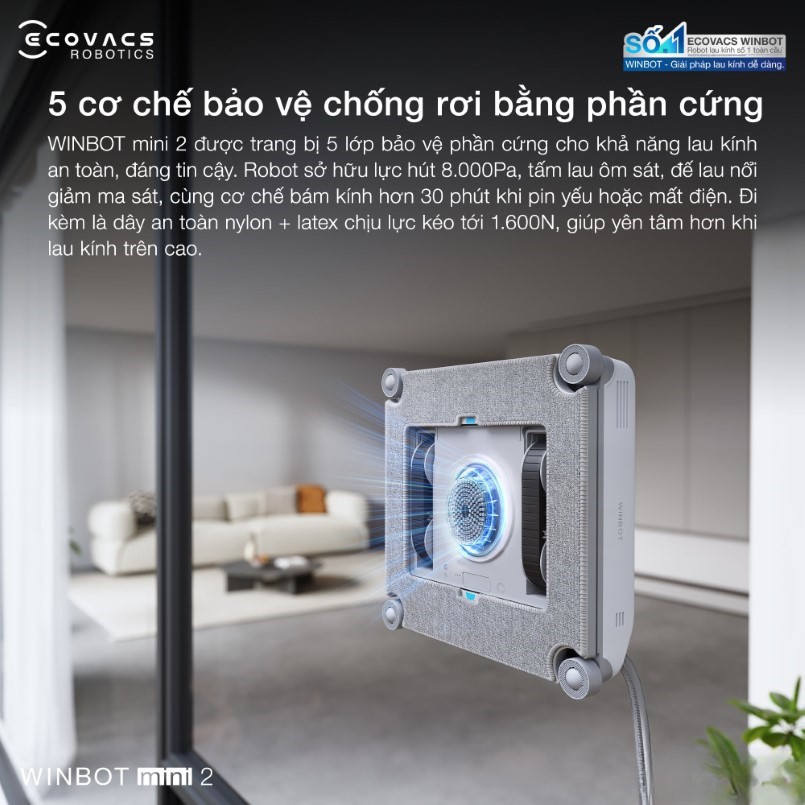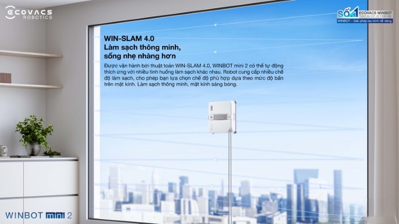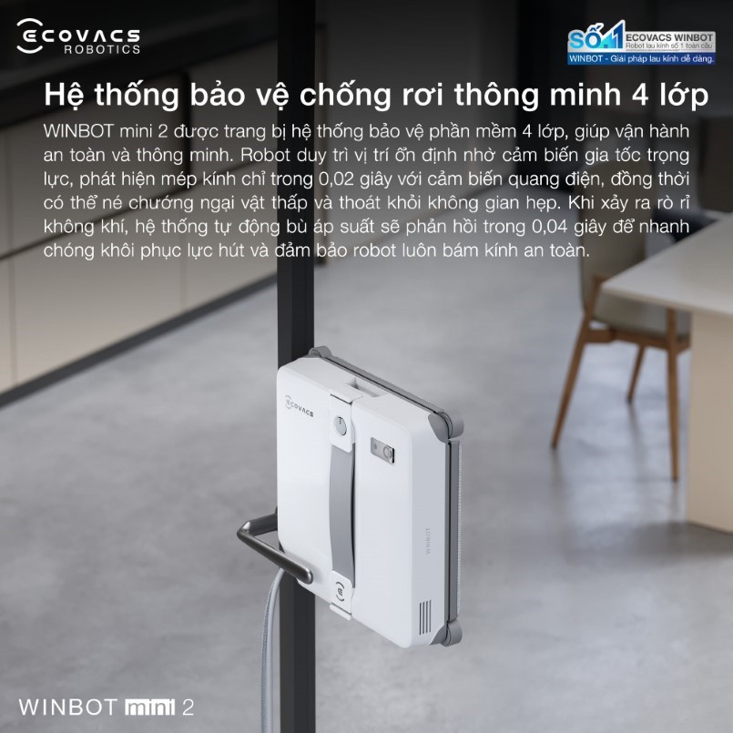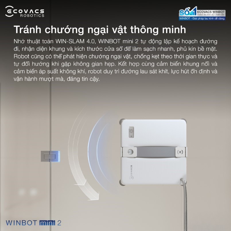 Không chỉ dừng lại ở đó, Ecovacs Winbot Mini 2 còn được trang bị thuật toán WIN-SLAM 4.0 thông minh, có khả năng tự động nhận diện và tối ưu đường đi, thích ứng linh hoạt với từng tình huống. Đi kèm đó là hệ thống an toàn chống rơi 4 lớp cùng 5 cơ chế bảo vệ, giúp bạn hoàn toàn yên tâm khi sử dụng trên cao.