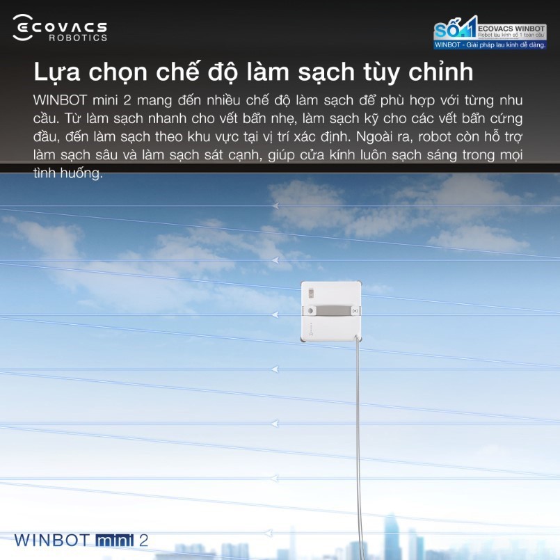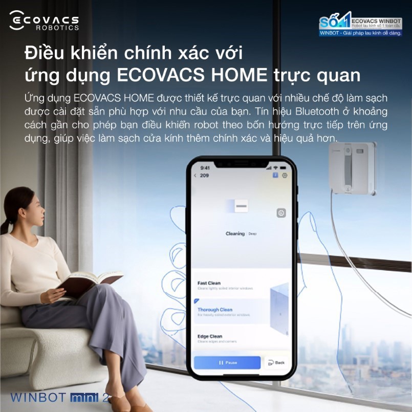 Bên cạnh đó, các chế độ làm sạch sát cạnh và làm sạch sâu toàn diện giúp tối ưu hiệu quả ở những vị trí khó tiếp cận. Đặc biệt, tính năng làm sạch theo khu vực của Ecovacs Winbot Mini 2 cho phép tập trung xử lý chính xác các điểm bám bẩn nặng, đảm bảo bề mặt kính luôn trong suốt và hoàn hảo trong mọi tình huống.
